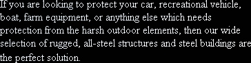 Our unique product set is not only limited to carports, enclosed garages, triple wide and 40' buildings. We are able to provide: * REMOTE CONTROLED ROLL-UP DOORS * 10' WIDE UP TO 40' WIDE CLEAR SPAN AND AS LONG AS YOU NEED IT * 14' LEG HEIGHT IF NEEDED * 12' WIDE ROLL-UP DOORS * TWO TONE COLOR SIDES AND ENDS * PRODUCTS CAN BE PURCHASED OVER THE TELEPHONE * FREE INSTALLATION ON YOUR LEVEL LAND * 13 COLORS & CUSTOM STYLES AVAILABLE |